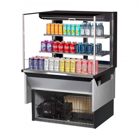 Drop-In Horizontal Open Display Case, low profile, 11.1 cu. ft. capacity, 35-7/8"W x 33-3/4"D x 52-1/2"H, self-contained refrigeration with self-cleaning condenser, (2) glass shelves + deck, tempered glass front shield & side walls, rear sliding glass doors, solar digital thermometer, digital electronic thermostat with defrost control, LED interior lighting, stainless steel interior, specify exterior color, front air intake & rear air discharge, includes night cover, R290 Hydrocarbon refrigerant, (2) 3/4 HP, 115v/60/1ph, 11.3 amps, cord with NEMA 5-20P, cETLus, ETL-Sanitation (Contact sales for lead time)