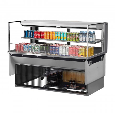 Drop-In Horizontal Open Display Case, low profile, 13.0 cu. ft. capacity, 59-7/8"W x 33-3/4"D x 44-1/4"H, self-contained refrigeration with self-cleaning condenser, (1) glass shelf + deck, tempered glass front shield & side walls, rear sliding glass doors, solar digital thermometer, digital electronic thermostat with defrost control, LED interior lighting, stainless steel interior & exterior, front air intake & rear air discharge, includes night cover, R290 Hydrocarbon refrigerant, (2) 3/4 HP, 115v/60/1-ph, 15.0 amp, cord with NEMA 5-20P, cETLus, ETL-Sanitation (Contact sales for lead time)