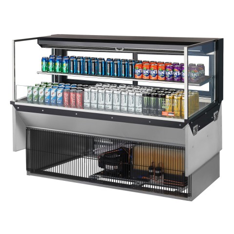 Drop-In Horizontal Open Display Case, low profile, 13 cu. ft. capacity, 59-7/8"W x 33-3/4"D x 44-1/4"H, self-contained refrigeration with self-cleaning condenser, (1) glass shelf + deck, tempered glass front shield & side walls, rear sliding glass doors, solar digital thermometer, digital electronic thermostat with defrost control, LED interior lighting, stainless steel interior, specify exterior color, front air intake & rear air discharge, includes night cover, R290 Hydrocarbon refrigerant, (2) 3/4 HP, 115v/60/1ph, 15.0 amps, cord with NEMA 5-20P, cETLus, ETL-Sanitation (Contact sales for lead time)