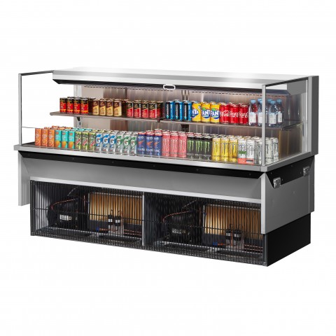 Drop-In Horizontal Open Display Case, low profile, 15.8 cu. ft. capacity, 71-7/8"W x 33"D x 44-1/4"H, self-contained refrigeration with self-cleaning condenser, (1) tier with (2) glass shelves + deck, tempered glass front shield & side walls, solar digital thermometer, digital electronic thermostat with defrost control, LED interior lighting, stainless steel interior & exterior, back wall & deck pan, front air intake & rear air discharge, includes night cover, R290 Hydrocarbon refrigerant, (4) 3/4 HP, 220v/60/1-ph, 13.0 amps, cord with NEMA 6-20P, cETLus, ETL-Sanitation (Contact sales for lead time)