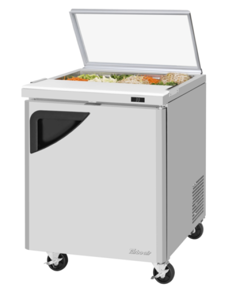 Super Deluxe Sandwich/Salad Unit with Glass Lid, one-section, 7.0 cu. ft., 27-1/2"W x 32-7/8"D x 31-3/4"H, (8) 1/6 size 4" deep pans, (1) solid door, stainless steel interior & exterior (galvanized steel back & bottom), ABS door liner, (1) stainless steel wire shelf, self-cleaning condenser equipped, cold air compartment, 6-1/4" deep cutting board with side rail, self-contained rear mounted refrigeration system, R290 Hydrocarbon refrigerant, 1/6 HP, 115v/60/1-ph, 6.6 amps, NEMA 5-15P, cETLus, ETL-Sanitation, Made in USA (contact sales for lead time)