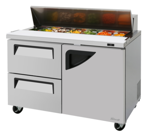 Super Deluxe Sandwich/Salad Unit, two-section, 48-1/4"W x 30"D x 37"H, 15 cu. ft., stainless steel top with 12-pan opening, (2) drawers on left, (1) right hinged door on right, stainless steel interior & exterior (galvanized steel back & bottom), (1) stainless steel wire shelf, self-cleaning condenser equipped, cold air compartment, insulated pan cover, cutting board side rail, self-contained rear mounted refrigeration system, R290 Hydrocarbon refrigerant, 1/5 HP, 115v/60/1-ph, 6.5 amps, NEMA 5-15P, cETLus, ETL-Sanitation (contact sales for lead time)