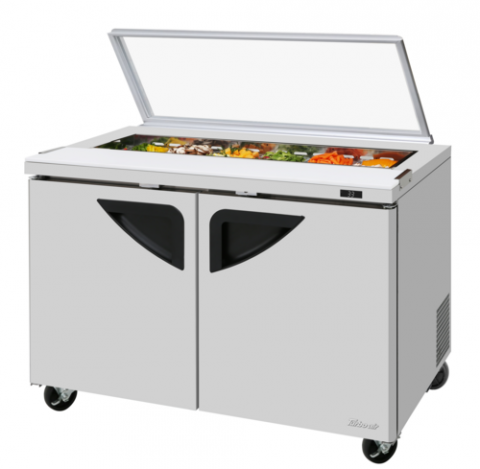Super Deluxe Sandwich/Salad Unit with Glass Lid, two-section, 12.0 cu. ft., 48-1/4"W x 32-7/8"D x 31-3/4"H, 12-pans, (2) stainless steel doors with recessed handles, stainless steel interior & exterior (galvanized steel back & bottom), ABS door liner, (2) stainless steel wire shelving, self-cleaning condenser equipped, cold air compartment, 6-1/4" deep cutting board with side rail, self-contained rear mounted refrigeration system, R290 Hydrocarbon refrigerant, 1/6 HP, 115v/60/1-ph, 6.5 amps, NEMA 5-15P, cETLus, ETL-Sanitation, Made in USA (contact sales for lead time)