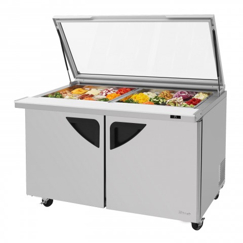 Super Deluxe Sandwich/Salad Mega Top Unit with Glass Lid, two-section, 19.0 cu. ft., stainless steel top with 24-pan opening, (2) stainless steel doors with recessed handles, ABS door liner, (2) stainless steel wire shelves, self-cleaning condenser equipped, cold air compartment, insulated pan cover, cutting board side rail, LED interior lighting & fan control, cold bunker system, self-contained rear mounted refrigeration system, R290 Hydrocarbon refrigerant, stainless steel interior & exterior (galvanized bottom), 1/5 HP, 115v/60/1-ph, 8.9 amps, NEMA 5-15P, ETL-Sanitation, cETLus, Made in USA (allow 7-8 weeks lead time for TST-GL models)