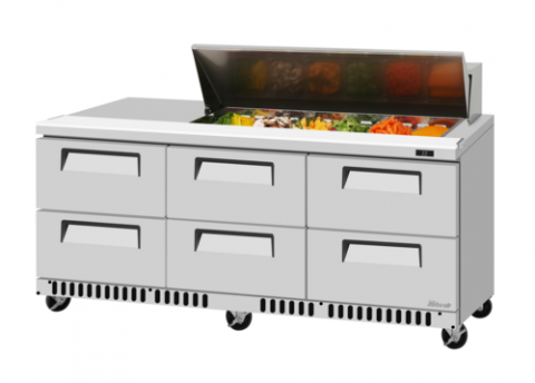 Super Deluxe Sandwich/Salad Prep + Work Station, Front Breathing airflow, three-section, 72-5/8"W x 30"D x 37-5/8"H, 20.5 cu. ft., (12) 1/6 size 4" deep pans, (6) Drawers, cold air compartment, insulated pan cover, 9-1/2"D cutting board, digital temperature control & monitoring system, LED interior lighting & fan control, stainless steel interior & exterior (galvanized steel back & bottom), self-cleaning condenser equipped, R290 Hydrocarbon refrigerant, 3/8 HP, 115v/60/1-ph, 9.9 amps, NEMA 5-15P, cETLus, ETL-Sanitation, Made in USA (contact sales for lead time)