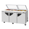 Super Deluxe Sandwich/Salad Unit with Glass Lid, three-section, 19.0 cu. ft., 72-5/8"W x 32-7/8"D x 31-3/4"H, 18-pans, (3) stainless steel doors with recess handles, stainless steel interior & exterior (galvanized steel back & bottom), ABS door liner, LED interior light, (3) stainless steel wire shelving, self-cleaning condenser equipped, cold air compartment, 6-1/4" deep cutting board with side rail, self-contained rear mounted refrigeration system, R290 Hydrocarbon refrigerant, 3/8 HP, 115v/60/1-ph, 9.9 amps, NEMA 5-15P, cETLus, ETL-Sanitation, Made in USA (contact sales for lead time)