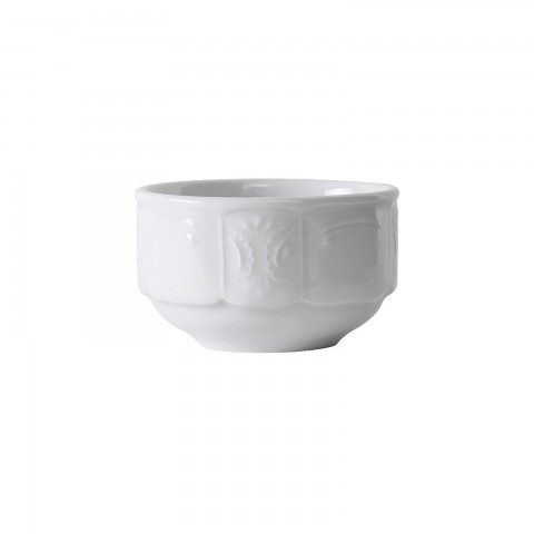 Bouillon, 7 oz., 3-1/2" dia. x 2-1/8" H, round, stackable, embossed, microwave & dishwasher safe, oven proof, fully vitrified, lead-free, TuxCare®©, Healthcare, Chicago, Porcelain White