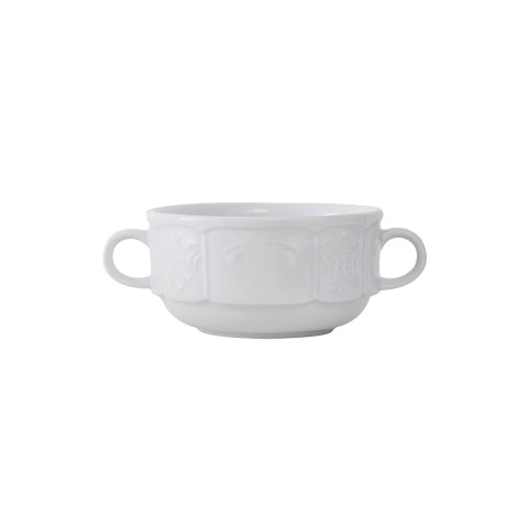 Soup Mug, 10 oz., 4-1/4" dia. x 2-1/4"H, stackable, embossed, double handled, microwave & dishwasher safe, oven proof, fully vitrified, lead-free, Chicago, Porcelain White