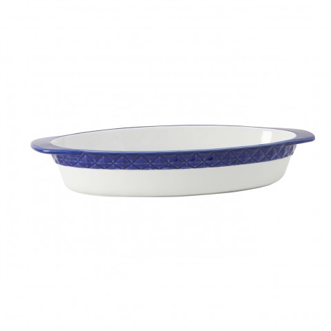 Casserole Dish, 3-1/2 qt., 17-3/4"L x 8-1/2"W x 3"H (15-3/4"L without handle), oval, without lid, embossed, microwave & dishwasher safe, oven proof, fully vitrified, lead-free, DisplayTux®©, Porcelain White with Cobalt Band