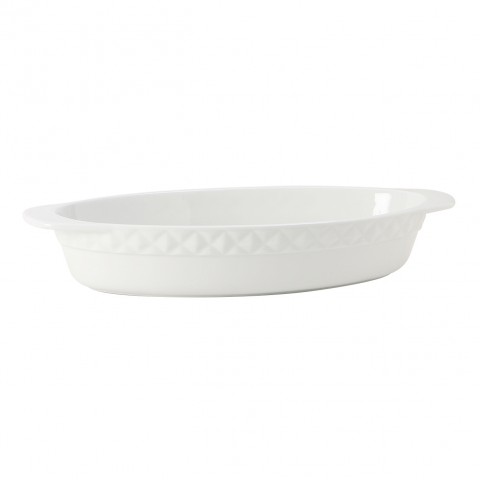 Casserole Dish, 3-1/2 qt., 17-3/4"L x 8-1/2"W x 3"H (15-3/4"L without handle), oval, without lid, embossed, microwave & dishwasher safe, oven proof, fully vitrified, lead-free, DisplayTux®©, Porcelain White with White Band