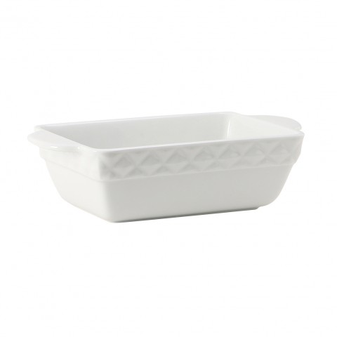 Casserole Dish, 1-1/2 qt., 11"L x 6"W x 3"H (9"L without handle), rectangular, without lid, without lid, embossed, microwave & dishwasher safe, oven proof, fully vitrified, lead-free, DisplayTux®©, Porcelain White with White Band