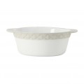 Casserole Dish, 3-1/2 qt., 12" dia. x 4"H (10" dia. without handle), round, without lid, embossed, microwave & dishwasher safe, oven proof, fully vitrified, lead-free, DisplayTux®©, Porcelain White with White Truffle Band