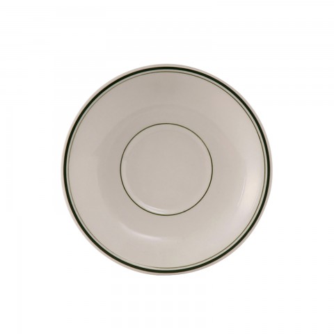 Saucer, 6" dia., round, coupe, wide rim, rolled edge, microwave & dishwasher safe, oven proof, fully vitrified, lead-free, ceramic, Green Bay, American White/Eggshell with Green Band