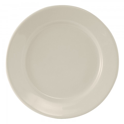 Plate, 10-1/2" dia., round, wide rim, rolled edge, microwave & dishwasher safe, oven proof, fully vitrified, lead-free, ceramic, Reno, American White/Eggshell