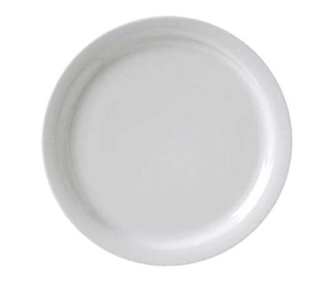 Plate, 9" dia., round, narrow rim, rolled edge, porcelain, bright white, Universal, Catalina Collection