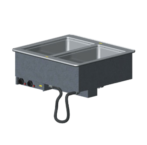 Hot Food Well Unit, Drop-In, electric, (2) 12" x 20" individual 20 gauge stainless steel insulated wells, 28-1/4"W x 26"D x 21-1/2"H (overall), wet operation only, auto-fill, individual thermostatic controls mounted in panel with cord, power indicator light, drip-free flange, 1" copper manifold drain with individual well shutoffs & manifold shutoff, 18 gauge stainless steel top, 18 gauge galvanized exterior housing, includes positioning clips, 2000 watts, 208-240v/60/1-ph, 7.2-8.3 amps, cord with NEMA 6-15P, NSF, cULus, Made in USA (27-1/2"W x 25-1/4"D cutout size, requires 7/8" corner radius) (Refer to vollrathfoodservice.com for full warranty policy)