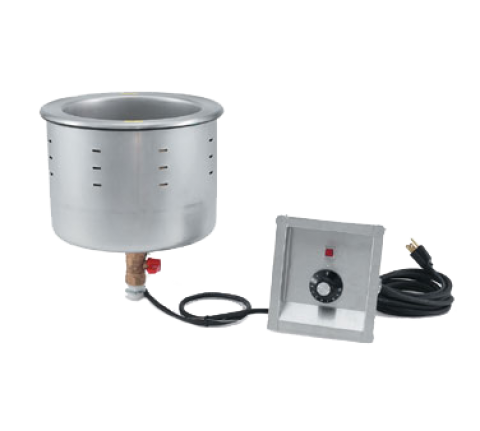 Soup Well, drop-in, infinite control mounted in stainless steel corded control panel, wet operation only, accommodates (1) 7-1/4 quart inset, over flange 10-3/16" dia., cutout 10-9/16" dia, outside 11-3/16" dia, well outer 10-5/16" dia., 3/4" drain, 120v/60/1-ph, 720 watts, 6.0 amps, cord with NEMA 5-15P, cULus, NSF, Made in USA (Refer to vollrathfoodservice.com for full warranty policy)