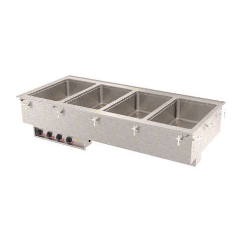 Hot Food Well Unit, Drop-In, electric, (4) 12" x 20" individual 20 gauge/316 marine grade stainless steel insulated wells, 54-3/4"W x 26"D x 21-1/2"H (overall), wet operation only, individual thermostatic controls mounted in panel with cord, power indicator light, drip-free flange, 1" copper manifold drain with individual well shutoffs & manifold shutoff, 18 gauge stainless steel top, stainless steel exterior housing, includes positioning clips, 2500 watts, 240v/60/1-ph, 14.0 amps, cord with NEMA 6-15P, NSF, cULus, Made in USA (54"W x 25-1/4"D cutout size, requires 7/8" corner radius) (Refer to vollrathfoodservice.com for full warranty policy)