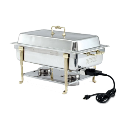 Classic Design Full-Size Brass Trim, 9 quart, electric chafer, stainless, mirror finish, SHORT END PLUG-IN, UL, complete with brass trim rack, dripless water pan, 2-1/2" SPVfood pan, dome cover, & (2) fuel holders, USA (Refer to vollrathfoodservice.com for full warranty policy)