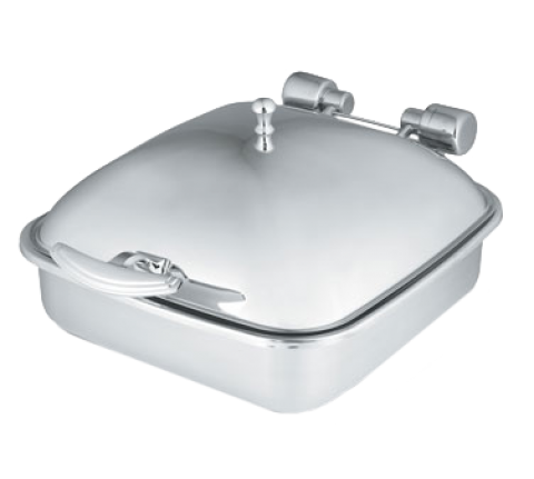 Intrigue® Induction Square Chafer, 6 quart (5.8L) chafer & food pan constructed of Mirror finish 18/8 stainless steel with 18-0 stainless water pan, removable cover with baffle hinge, 45° or 90° position, reinforced bracket with rubber table feet, imported (Refer to vollrathfoodservice.com for full warranty policy)