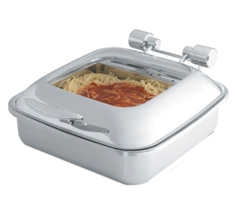 Intrigue® Induction Square Glass Top Chafer, 6 quart (5.8L) chafer constructed of Mirror finish 18/8 stainless steel trim with 18-8 stainless food pan & 18-0 stainless water pan, removable cover with baffle hinge, 45° or 90° position, reinforced bracket with rubber table feet, imported (Refer to vollrathfoodservice.com for full warranty policy)