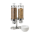 Somerville™ Double Cereal Dispenser, 4 quart per dispenser, heavy-gauge stainless steel mirror finish, pedestal base with removable drip cover for easy cleaning, rotating dispensing handle with paddle control for flow of food product, removable cover, 12"L x 8-3/4"W x 23-5/8"H, imported (Refer to vollrathfoodservice.com for full warranty policy)