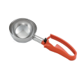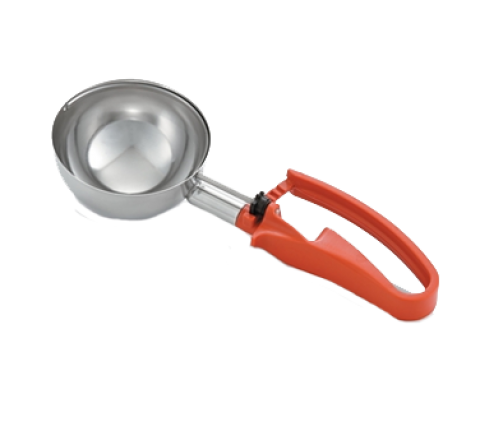 Disher, standard length, 8 oz., size 4, 3-5/8" dia., one-piece, two-part construction, stainless steel scoop & shaft, orange color-coded 6-7/16" long ergonomic plastic handle, designed for left or right-handed users, not recommended for use with ice cream or hard products, NSF (Refer to vollrathfoodservice.com for full warranty policy)