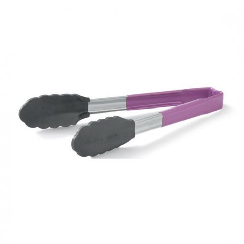 Utility Tongs, one-piece, 9-1/2" long, heavy gauge stainless, high temperature black nylon ends (heat resistant up to 450°F (232°C)), purple ergonomic antimicrobial Kool-Touch® handles (heat safe up to 350°F (176.6°C), dishwasher safe, Made in USA, Jacob's Pride® Collection, Limited Lifetime Warranty (Refer to vollrathfoodservice.com for full warranty policy)