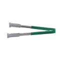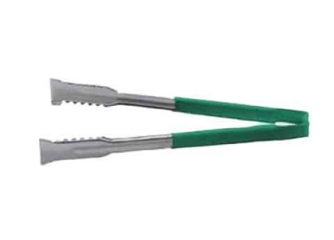 VersaGrip™ Tongs, one-piece, 9-1/2" (24.1 cm), flattened ends, gripper teeth, springless design, green ergonomic antimicrobial Kool-Touch® handle (heat resistant to 225°F (107.2°C), fully functional to 350° F (176.6 C), dishwasher safe, stainless steel, NSF, Made in USA, Jacob's Pride® Collection, Limited Lifetime Warranty (Refer to vollrathfoodservice.com for full warranty policy)