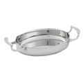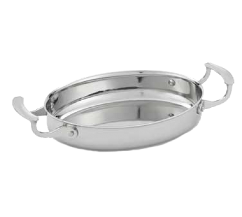 Miramar™ Display Cookware Oval Au Gratin, 1-13/16 quart, 10"W x 7-1/2"D x 2-1/16"H, 3-ply construction, 18-8 stainless interior, 18-0 stainless exterior, 3004 aluminum core bottom & side walls, satin finish interior & exterior with mirror finish welded handles, for use with gas, electric or induction ranges, NSF, imported, Jacob's Pride® Collection, Limited Lifetime (Refer to vollrathfoodservice.com for full warranty policy)