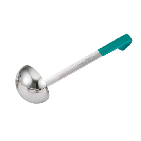 Ladle, equipped with all-natural antimicrobial, one-piece, heavy duty, 6 oz. (177.4 ml), 18/8 stainless steel, 14 ga 12-3/8" grooved hooked teal Kool-Touch™ handle with satin finish, 18 ga 3-1/2" bowl dia with mirror finish, stamped capacity in oz., & ml on front side of handle, NSF, imported, Jacob's Pride® Collection, Limited Lifetime Warranty (Refer to vollrathfoodservice.com for full warranty policy)