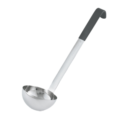 Ladle, equipped with all-natural antimicrobial, one-piece, heavy duty, 8 oz. (236.6 ml), 18/8 stainless steel, 11 ga 12-5/8" grooved hooked black Kool-Touch™ handle with satin finish, 18 ga 4" bowl dia with mirror finish, stamped capacity in oz., & ml on front side of handle, NSF, imported, Jacob's Pride® Collection, Limited Lifetime Warranty (Refer to vollrathfoodservice.com for full warranty policy)