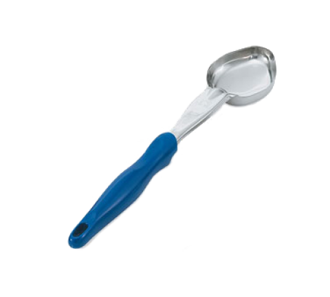 Spoodle®, 1-piece heavy duty, solid oval bowl, handle coded blue, equipped with all-natural antimicrobial, 2 oz. (59.1ML), 18/8 304 stainless steel, ergonomic design high temperature textured nylon handle heat resistant to 450°F (232°C), built-in stopper notch, capacity stamped on shaft, 13-1/16" overall L, 2-15/16"L bowl diameter, limited warranty, NSF, imported, Jacob's Pride® Collection, Limited Lifetime Warranty (Refer to vollrathfoodservice.com for full warranty policy)