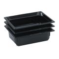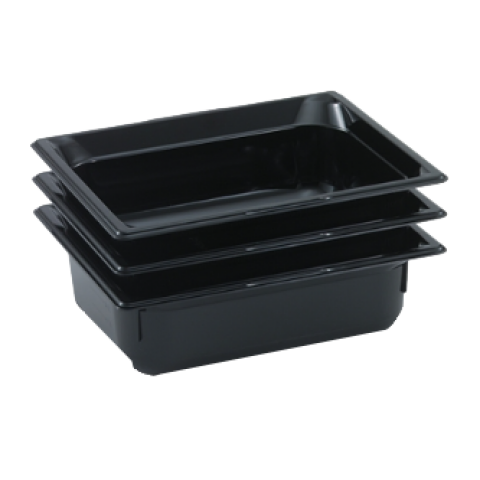 Super Pan® 1/1 GN Food Pan, 2-1/2" deep, low-temp polycarbonate black plastic, top flange corners with concave indentation, anti-jamming, ramped sides, reverse form flattened edge, framing shoulder, interchanges with SPV stainless steel pan line, NSF, meets gastronorm (EN 631-1) standard (Refer to vollrathfoodservice.com for full warranty policy)