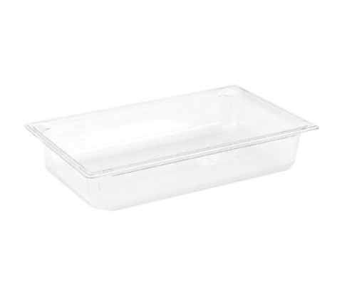 Super Pan® 1/1 GN Food Pan, 4" deep, low-temp polycarbonate clear plastic, top flange corners with concave indentation, anti-jamming, ramped sides, reverse form flattened edge, framing shoulder, interchanges with SPV stainless steel pan line, NSF, meets gastronorm (EN 631-1) standard, Made in USA (Refer to vollrathfoodservice.com for full warranty policy)