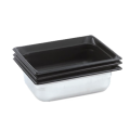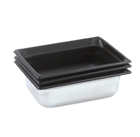 Super Pan 3® 1/2 GN Food Pan, 2-1/2" deep (65mm), 4 qt capacity, 22/300 series stainless steel with black SteelCoatX3 coating, non-stick, top flange corners with concave indentation, ramped sides, reverse form flattened edge, framing shoulder, interchangeable with SPV plastic pan line, meets gastronorm (EN 631-1) standard, NSF, Made in USA (Refer to vollrathfoodservice.com for full warranty policy)