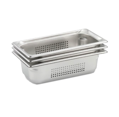 Super Pan 3® 1/3 GN Food Pan, perforated, 2-1/2" deep (65mm), 22 gauge, 300 series stainless steel, top flange corners with concave indentation, ramped sides, reverse form flattened edge, framing shoulder, interchanges with SPV plastic Pan Line, meets gastronorm (EN 631-1) standard, NSF, Made in USA (Refer to vollrathfoodservice.com for full warranty policy)