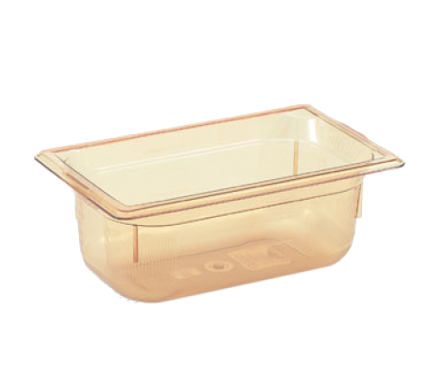 Super Pan® 1/4 GN Food Pan, 4" deep, high-temp amber resin, top flange corners with concave indentation, anti-jamming, ramped sides, reverse form flattened edge, framing shoulder, interchanges with SPV stainless steel pan line, NSF, meets gastronorm (EN 631-1) standard, Made in USA (Refer to vollrathfoodservice.com for full warranty policy)