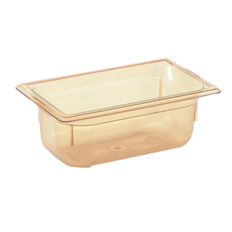 Super Pan® 1/4 GN Food Pan, 6" deep, high-temp amber resin, top flange corners with concave indentation, anti-jamming, ramped sides, reverse form flattened edge, framing shoulder, interchanges with SPV stainless steel pan line, NSF, meets gastronorm (EN 631-1) standard (Refer to vollrathfoodservice.com for full warranty policy)