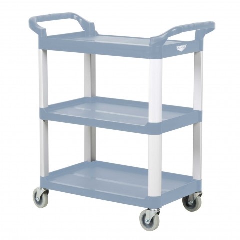 Plastic Cart, BLUE-GRAY multi-purpose, 300 lb, caster capacity, polypropylene shelves & handles, satin finish aluminum uprights, textured shelves, 4" swivel non-marking casters, easy to clean, shipped KD, 33"L x 16-13/16"W x 37"H, 16-1/2" x 26" shelf size, 11-3/4" height between shelves, imported (Refer to vollrathfoodservice.com for full warranty policy)