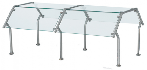 Standard Contemporary Breath Guards for Stainless Steel Countertops, 1" (2.5 cm) stainless steel tubular construction is sleek, durable, easy to clean and enhances the food presentation, panels are ³⁄₈" (9.5 mm) tempered glass with polished ends, available in brushed stainless steel, brass or black, mounts to stainless steel, solid surface and laminate countertops, NSF