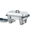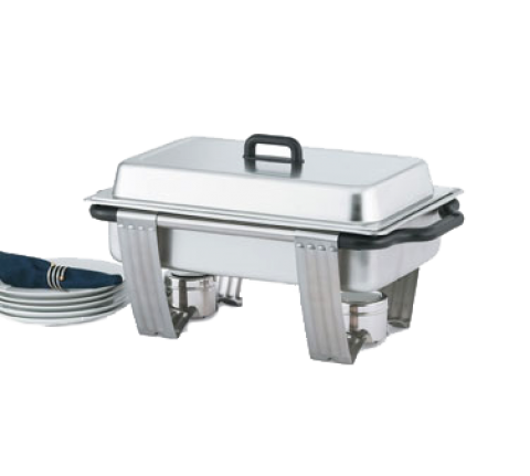 Dakota™ Rectangular Chafer, 9 quart, 1-piece, 18/8 stainless steel matte finish, embos, legs, tubular designed frame, molded hi-temp, nylon side handles, Kool-Touch® nylon cover handles, stacking frame, with SPV full size 2-1/2" food pan, water pan, dome cover, frame & 2 fuel holders, USA (Refer to vollrathfoodservice.com for full warranty policy)