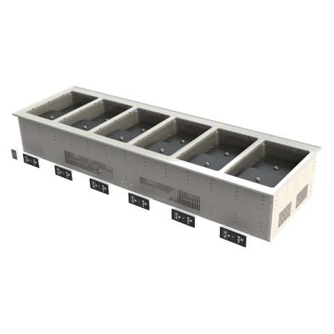 Induction Hot Food Well Drop-In, electric, dry operation, (6) well, 81-1/4"W x 26"D, individual heat & power controls per well, (3) power levels per well (low/medium/high), temperature range 140°-190°F, (2) induction capsules per well creates (2) heat zones in each well, (heat zones can operate independently or be synced), accommodates Vollrath induction-ready steam table pans (1) full-size (2-1/2" or 4" deep) or (2) half-size (2-1/2" or 4" deep) per well, 208-240v/60/1-ph, 4760 watts, 19.8 amps, cord with NEMA 6-30P, NSF, cULus, UL, FCC, Made in USA (made to order) (Refer to vollrathfoodservice.com for full warranty policy)