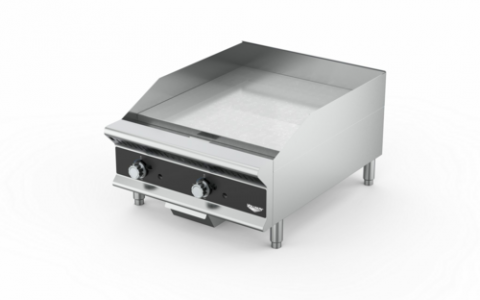 Heavy-Duty Flat Top Gas Griddle, 36", 90,000 BTU, manual control, stainless 3 burners placed every 12" for 30,000 BTU per 12" cooking surface, polished surface 1" thick plate, stainless burner construction, stainless exterior, 4-3/8" backsplash and sloped side splash, shipped set up for natural gas, includes kit for conversion to propane, includes regulator & gas valve, metal knobs/ with heavy duty knob guards, (1) drip tray, 4"-5-1/2" adjustable legs, ETL, cETLus (Refer to vollrathfoodservice.com for full warranty policy)