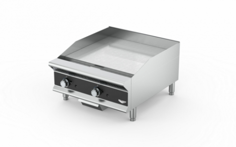 Medium-Duty Flat Top Gas Griddle, 48", 112,000 BTU, manual control, stainless 4 burners placed every 12" for 28,000 BTU per 12" cooking surface, polished surface 1" thick plate, stainless burner construction, stainless exterior, 2-3/4" backsplash and sloped side splash, shipped set up for natural gas, includes kit for conversion to propane, includes regulator & gas valve, metal knobs/ with heavy duty knob guards, 4"-5-1/2" adjustable legs, ETL, cETLus (Refer to vollrathfoodservice.com for full warranty policy)