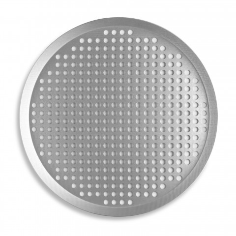 Pizza Pan, extra perforated, press cut, 14" diameter x 3/4" deep, 14 gauge 1-1/2 mm 3000 series aluminum, clear coat anodized finish, NSF (Refer to vollrathfoodservice.com for full warranty policy)