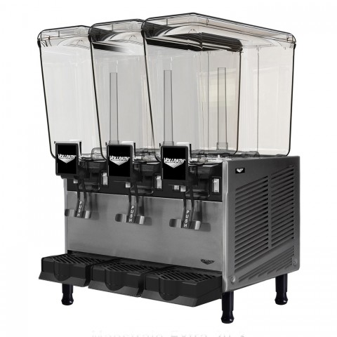 Vollrath Pre-Mix Refrigerated Beverage Dispenser, electric, fountain spray circulation, (3) 5.3 gallon polycarbonate food grade bowls, 35° to 41°F temperature range, (1) thermostat per bowl, rocker controls, stainless steel unibody cabinet, gravity fed, stainless steel spigot, ABS plastic drip trays, R404a, 115v/60/1-ph, 8 amps, NEMA 5-15P, cETLus, NSF (Refer to vollrathfoodservice.com for full warranty policy)