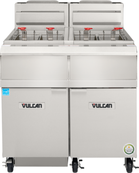 QuickFry™ Fryer, gas, high efficiency, 39 1/2"W, (2) battery, 75 lbs. capacity per vat, solid state analog knob control with melt cycles, electronic ignition, KleenScreen PLUS filtration system, twin baskets, stainless steel cabinet & fry tank, adjustable casters (2 swivel locking & 2 non-locking), 220,000 BTU, CSA, NSF, ENERGY STAR