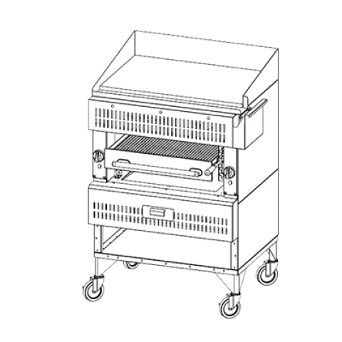 Heavy Duty Chophouse Broiler, 36" wide, gas, (3) 33,500 BTU burners, over-fired deck type, 5-position adjustable broiler grid, 1/2" certified griddle plate on top with 2" side & backsplashes, front grease trough, stainless steel front, sides, legs & undershelf, casters, 100,000 BTU, CSA, NSF