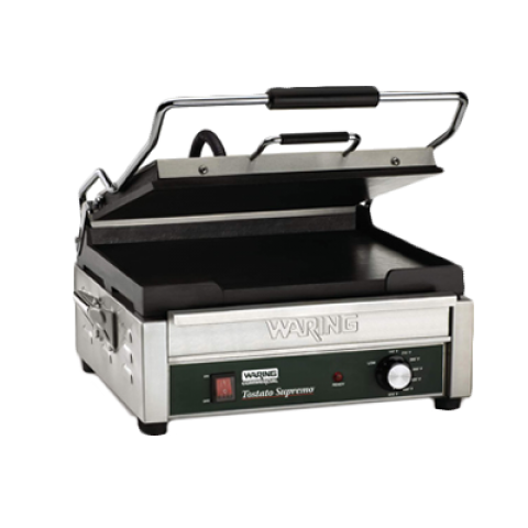 Tostato Supremo® Panini Grill, full size, 14"x14" flat cast iron cooking surface, hinged top, adjustable thermostat to 570°F (300°C), power & ready indicator lights, heat-resistant handles, brushed stainless steel body & removable drip tray, 120v/60/1-ph, 15.0amps, 1800 watts, cULus, NSF